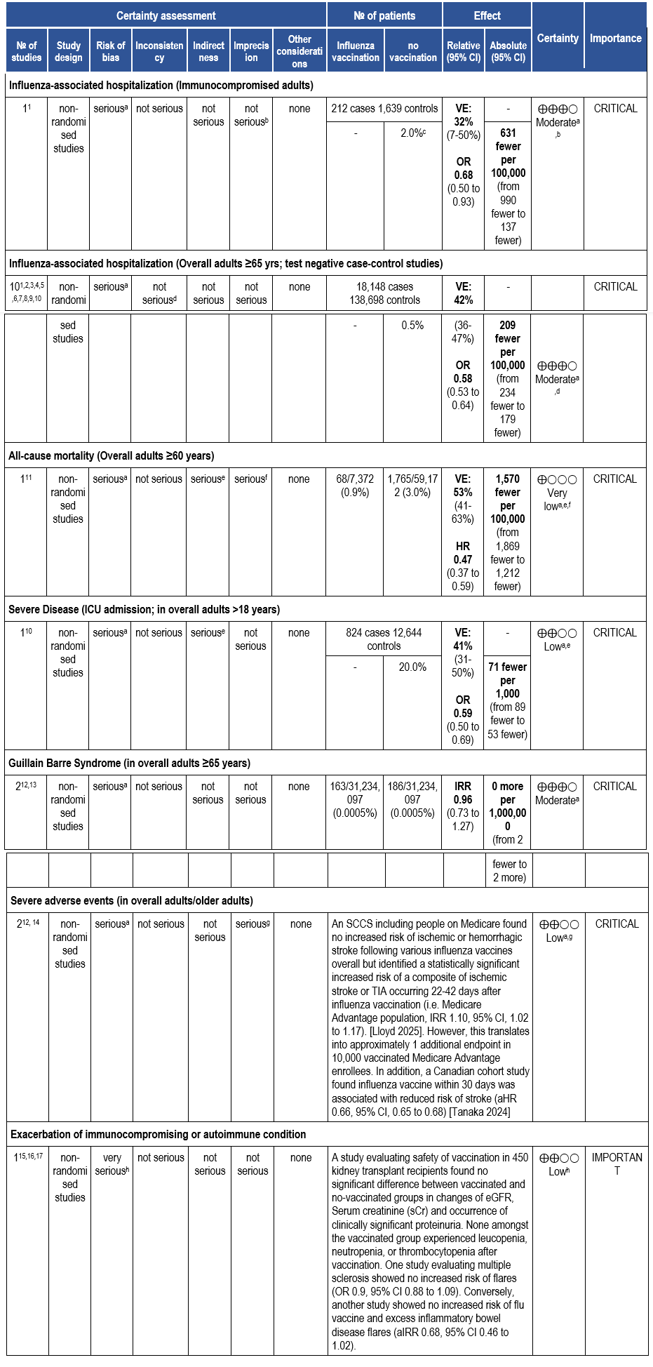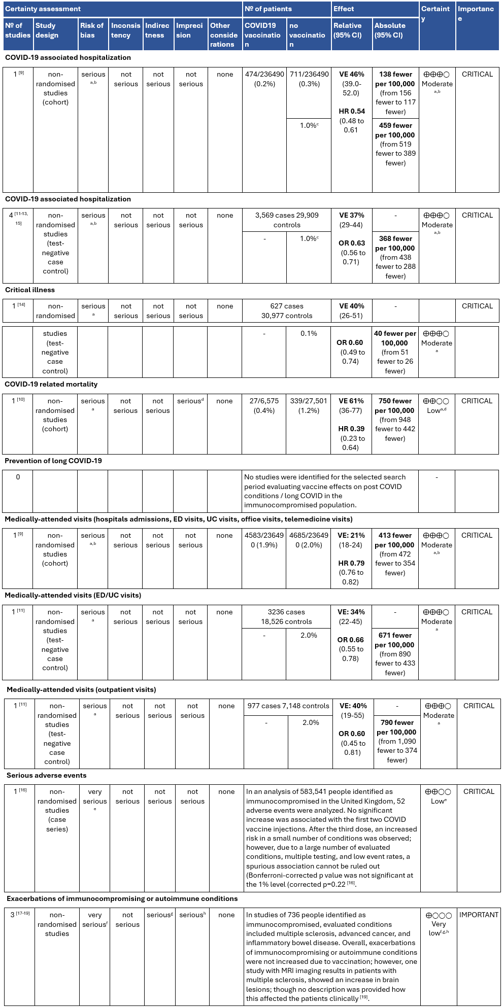 The panel agreed that the overall certainty of evidence is moderate due to evidence on COVID-19 vaccine effectiveness in immunocompromised patients driven by the prevention of hospitalization. The moderate size of beneficial effects combined with little or no serious adverse effects justifies a strong recommendation for the administration of the 2025-2026 COVID-19 vaccine.