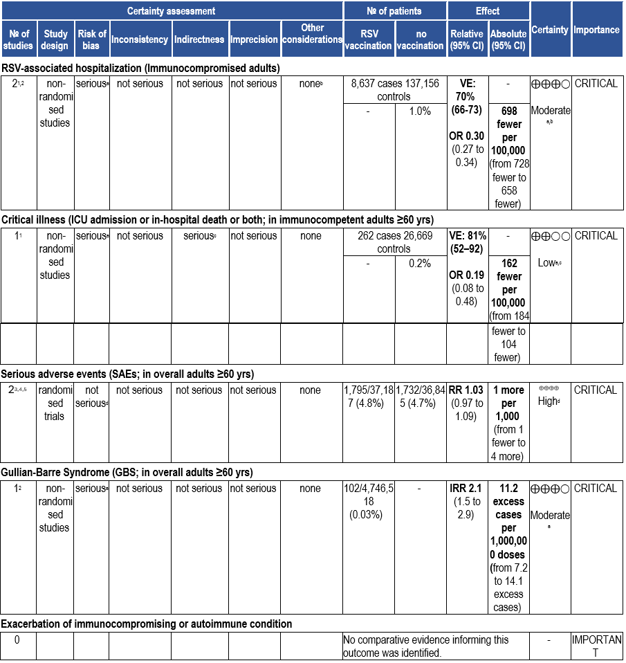 The panel agreed that the overall certainty of evidence is moderate due to evidence on RSV vaccine effectiveness in immunocompromised patients driven by the prevention of hospitalization. The large size of beneficial effects combined with little or no serious adverse effects justifies a strong recommendation for the administration of the RSV vaccine in immunocompromised population.