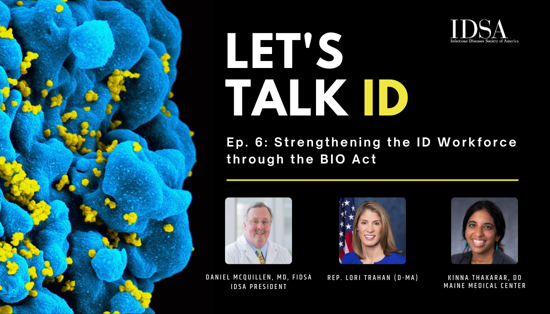 IDSA President Daniel McQuillen, MD, FIDSA is joined by Congresswoman Lori Trahan (D-MA) and IDSA Advocacy Liaison Kinna Thakarar, DO to discuss the Bolstering Infectious Outbreaks (BIO) Preparedness Workforce Act, new bipartisan legislation that would provide loan repayment for medical professionals who work in bio-preparedness or provide infectious diseases care in underserved areas or clinics and facilities that receive federal funding.