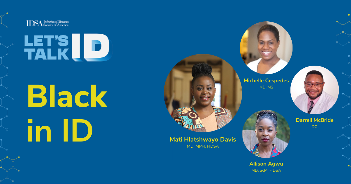 In honor of Black History Month, Let’s Talk ID host and IDSA Board member Mati Hlatshwayo Davis, MD, MPH, FIDSA, talks with HIVMA Chair Allison Agwu, MD, ScM, FIDSA, HIVMA Immediate Past Chair Michelle Cespedes, MD, MS, and HIVMA Board member Darrell McBride, DO, about their experiences as Black infectious diseases physicians.