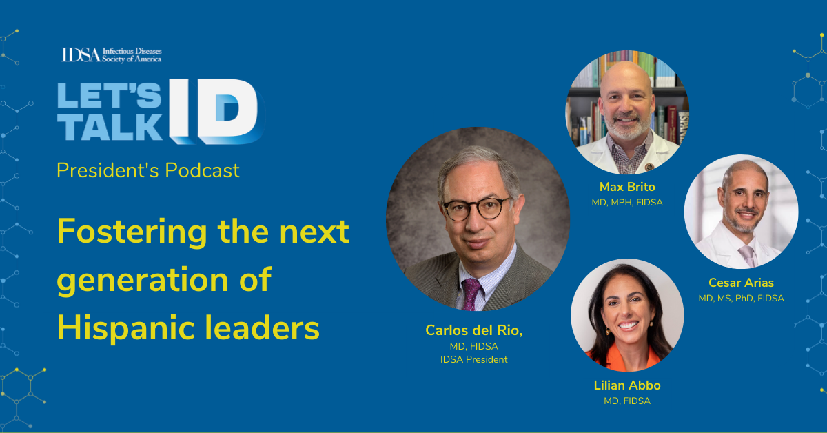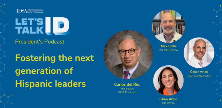 Carlos del Rio: [00:00:10] I am Carlos del Rio, president of IDSA. Welcome to the Let's Talk ID podcast. Joining me today are three of my fellow board members who, like me, are Hispanic ID physicians and foreign medical graduates. Dr. Lilian Abbo from Venezuela and now at the University of Miami, Dr. Cesar Arias from Colombia and now at Methodist Hospital in Houston, and Dr. Max Brito from the Dominican Republic, now at University of Chicago, Illinois. They are all here with me to have a conversation about Hispanic leadership in infectious disease. Buenos dias, doctores.