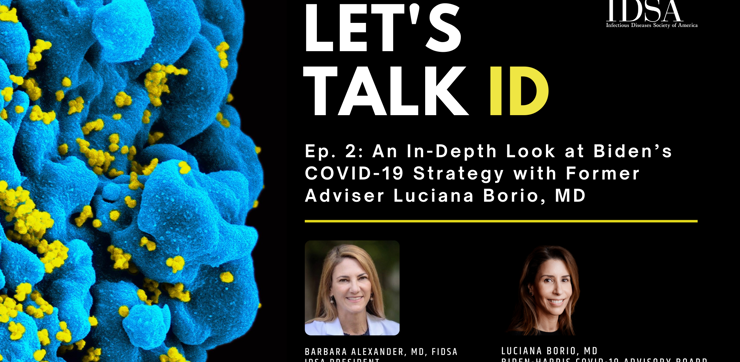 IDSA President Barbara Alexander, M.D., FIDSA is joined by Luciana Borio, MD, a member of the COVID-19 Advisory Board that convened during the Biden-Harris transition, to discuss the Administration’s COVID-19 strategy, vaccine production and distribution, EUA guidance for COVID-19 therapies and the importance of masking policies.