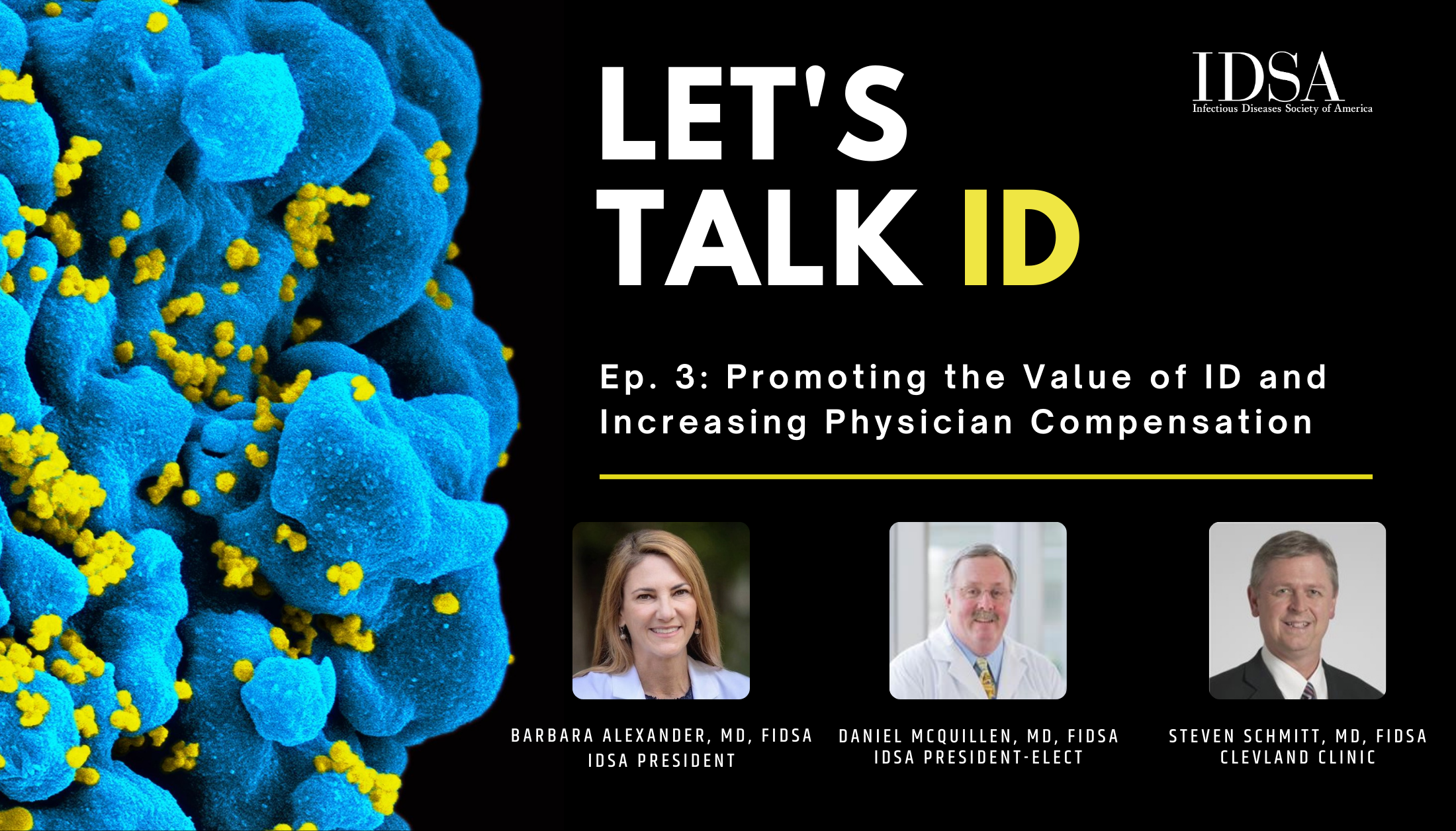 How can ID physicians advocate for improved physician value and compensation? In this episode, IDSA President Barbara Alexander, MD, FIDSA is joined by IDSA President-Elect Daniel McQuillen, MD, FIDSA of Lahey Hospital & Medical Center and Steven Schmitt, MD, FIDSA of the Cleveland Clinic to discuss increasing awareness, public support and compensation for ID professionals.