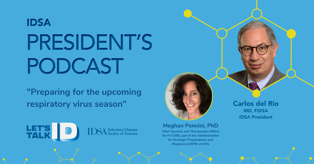 IDSA President Carlos del Rio, MD, FIDSA discusses what we can expect for the upcoming respiratory virus season with Meghan Pennini, PhD, the Chief Vaccines and Therapeutics Officer for H-CORE (the HHS Coordination Operations and Response Element) and the Office of the Assistant Secretary for Preparedness and Response (ASPR) at HHS.