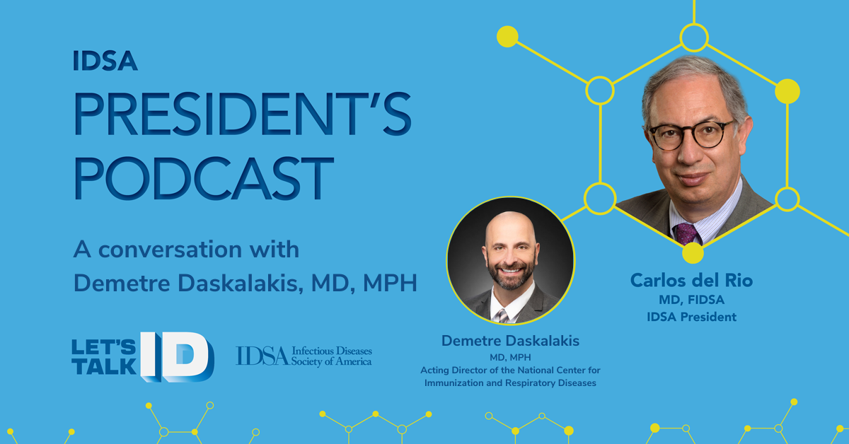 In his final President's Podcast, IDSA President Carlos del Rio, MD, FIDSA speaks with Demetre Daskalakis, MD, MPH, Acting Director of the National Center for Immunization and Respiratory Diseases, about his career path as an infectious diseases physician, how the U.S. can end the HIV epidemic and what he plans to discuss during his Joseph E. Smadel lecture at IDWeek 2023.