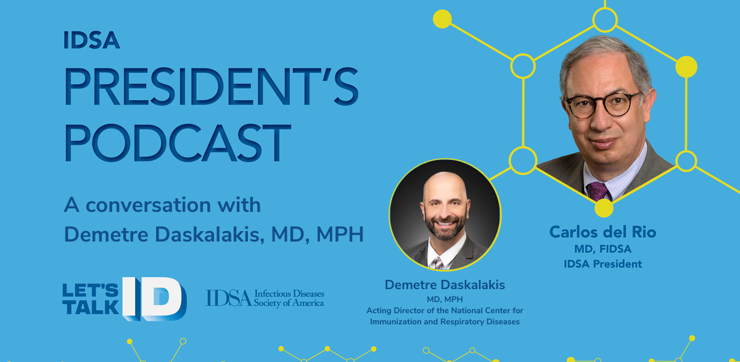 Carlos del Rio: [00:00:09] I am Carlos Del Rio, president of IDSA. Welcome to the Let's Talk ID podcast. Joining me today is my friend and colleague, Dr. Demetre Daskalakis, the Acting Director of the National Center for Immunization and Respiratory Diseases at the CDC. I asked him to talk to me about his broad and successful career in infectious disease. Welcome, Demetre.