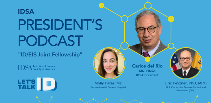 Carlos del Rio: [00:00:00] Hello and welcome to the Let's Talk ID podcast. I am Dr. Carlos Del Rio, the President of IDSA. And joining me today to discuss the ID/EIS joint fellowship are two guests, Dr. Molly Paras, program director of the Massachusetts General Hospital, Brigham and Women's Hospital Infectious Disease Fellowship, and Dr. Eric Pevzner, the Chief of the Epidemiology and Laboratory Workforce Branch in the Division of Workforce Development at CDC. Welcome, Molly. Welcome, Eric. Delighted to have you here. You know, at the recent CROI meeting, CDC Director Rochelle Walensky mentioned this program during her remarks at the Young Investigators Workshop. And many people asked me after that what this program was all about. So I'm really excited that we're going to be talking about it during this podcast because I think we need a little more people to hear what this fellowship is about. So, Molly. Why don't we start with you? This is going to be the first year of the joint ID fellowship program. What was the genesis of this program?