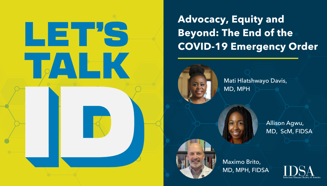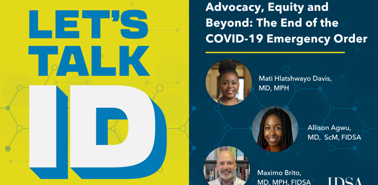 The lifting of the COVID-19 public health emergency at the federal level will have a significant impact on clinical care, public health and research in ID and beyond. In this episode, Mati Hlatshwayo Davis, MD, MPH, director of health for the city of St. Louis, is joined by Allison Agwu, MD, ScM, FIDSA, HIVMA chair-elect, and Maximo Brito, MD, MPH, FIDSA, an IDSA Board member, to discuss the urgency of prioritizing health equity beyond the end of the COVID-19 emergency order.