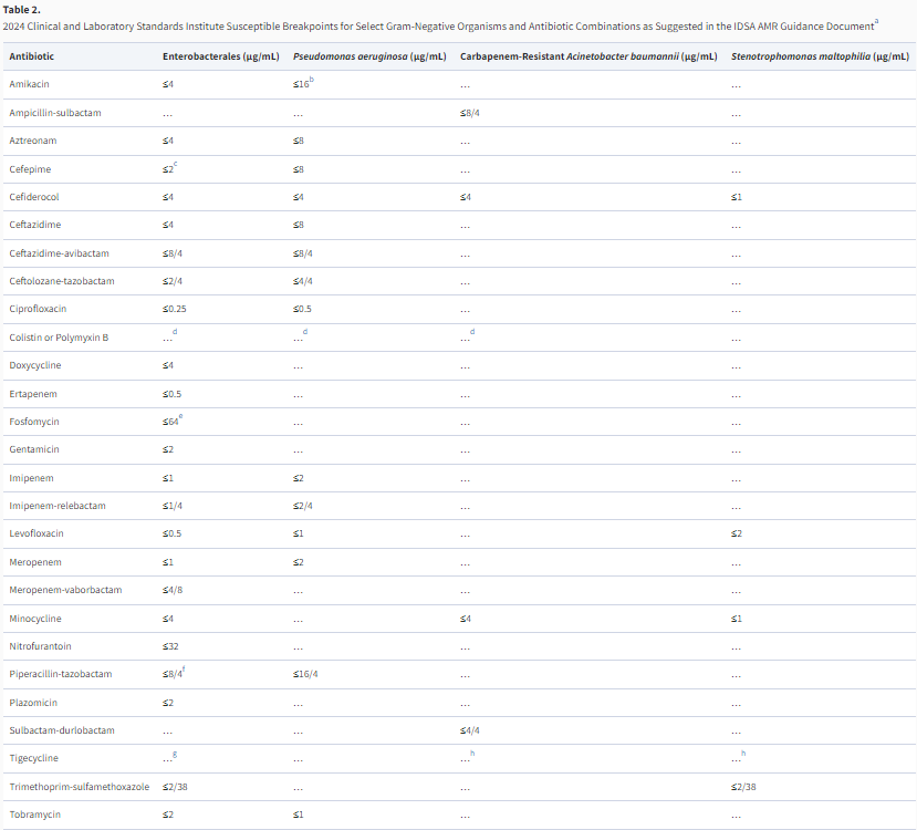 Table 2. 2024 Clinical and Laboratory Standards Institute Breakpoints for Select Gram-Negative Organisms and