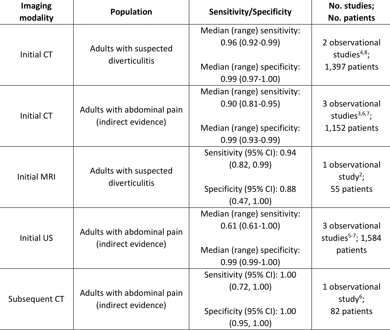 Summary of Evidence for Imaging Modalities Compared to Pathology for Diagnosing Acute Diverticulitis