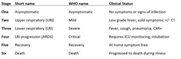 Current clinical staging for the SARS-CoV2/COVID-19 pandemic can be divided into the six presentations below. All six require the presence of viral nucleic acid detected in respiratory secretions, but in China and soon in the United States and other nations, will include IgM/IgG antibody testing.